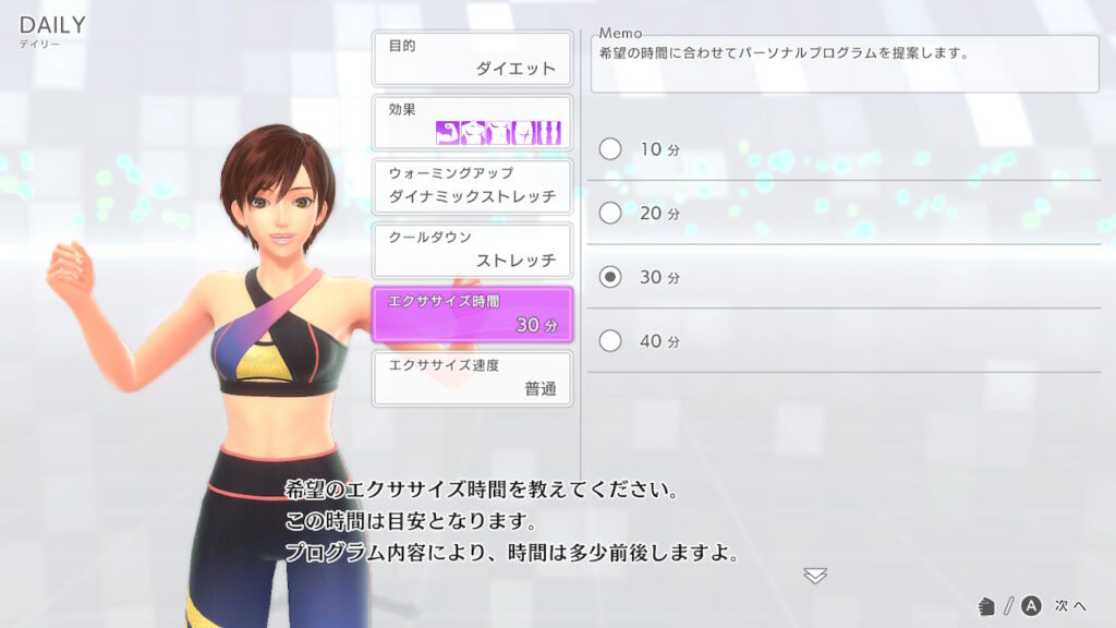 最優先はデイリーのエクササイズ時間を30分以上にすること。これはEXエクササイズの出現条件を確実に満たすためです。