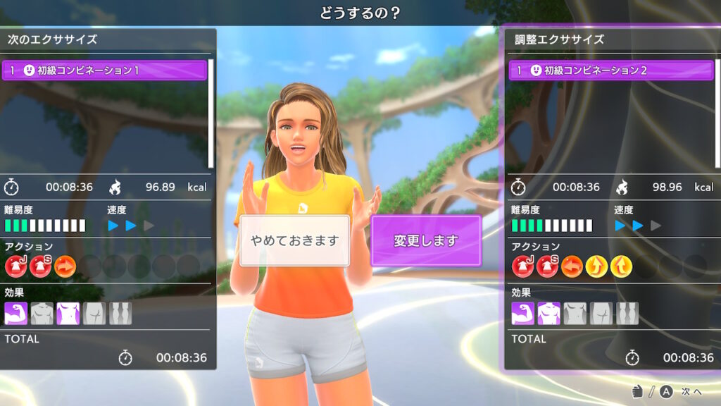 「はい」を選ぶと、明らかに動きが複雑になります。普段のデイリーより一段階上の運動量を体感できます。