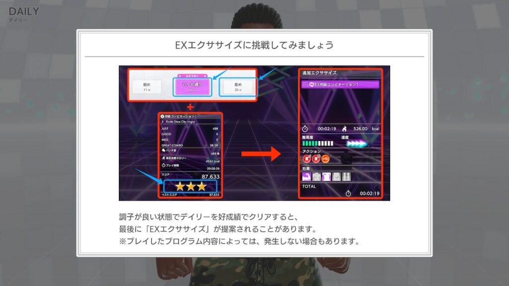 EXエクササイズと組み合わせると、デイリー本体で高難度メニューをこなし、最後にEXで追い込むという流れができ、2の鬼モード以上の運動量になります。