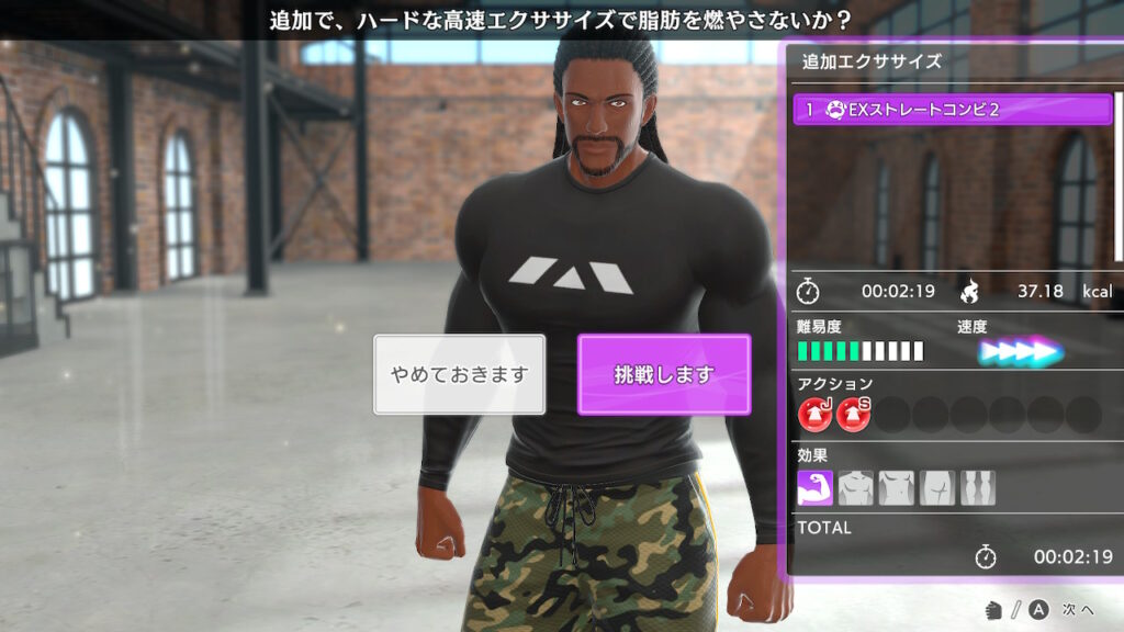 EXエクササイズ(追いトレ)は、3で新しく追加された短時間・超高速のエクササイズです。デイリーエクササイズの後、トレーナーから「追いトレやる?」と提案されて始まります。